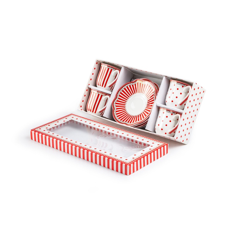 Each gift box includes – 4 demitasse cups with 4 saucers (2 stripe cups with 2 dot saucers & 2 dot cups with 2 stripe saucers).Please kindly note that demitasse/espresso cups are much smaller than the traditional tea cups. If you’re looking for regular size tea cups, please visit our Cups & Saucers section.