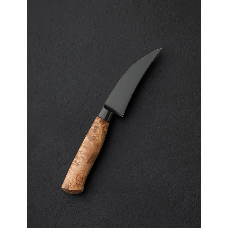 Dressed in beautiful, figured maple burl and delivered with a handmade buffalo leather saya, this William Porto bird's beak paring knife features a long, versatile blade of 5160 carbon steel with dark, matte, phosphated finish. This finish covering both bl