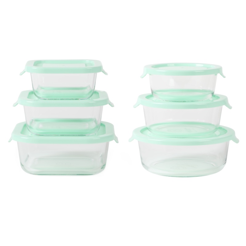 • WHAT’S IN THE BOX: Three round glass storage containers with lids (13.5oz, 22oz, and 32.1oz) and three square glass storage containers with lids (10.8oz, 17.6oz, and 27.1oz)