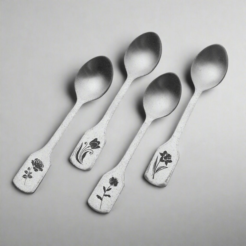 This Matte Floral Set of 4 Mini Coffee Spoons features a different, delicate floral motif on each handle. This beautiful spoon set will add a touch of elegance and style to serving appetizers, desserts and coffee or tea. Each spoon measures 4 3/4-inches lo