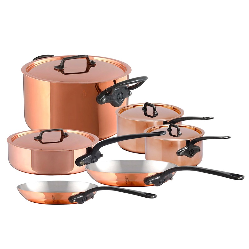 Mauviel M’Heritage cookware follows 7 generations of traditional French cookware craftsmanship. Each piece of Mauviel M’200 Ci cookware is painstakingly constructed of 90% copper and 10% high quality 18/10 stainless steel, giving you a final product that provides superior heat retention, conductibility, and eliminates hot spots when cooking. The M’200 Ci is a 2mm thick vessel that features a stainless steel cooking surface with a highly polished exterior. Finished with a cast iron handle, this cookware set is the definition of French traditional cookware.