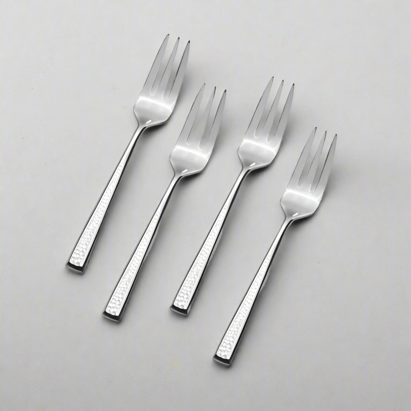 Towle Living Mea Forged Flatware is perfect for streamlining tables with smooth, clean lines, a beveled tip and polished finish. Quality crafted of 18/0 stainless steel and perfect for everyday use. This versatile set is an essential for eating seafood, like shrimp and oysters and perfect for special occasions or casual dining. Dishwasher safe. Set of 4 appetizer forks, each measures 5-1/2 inch long.