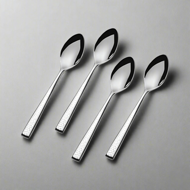This Towle Living Mea Set of 4Mini Coffee Spoons features a classic design with an attractive, frosted, hammered handle and is perfect for casual of formal dining. Crafted of forged 18/0 stainless steel. Dishwasher safe. Set of 4mini coffeespoons, each mea