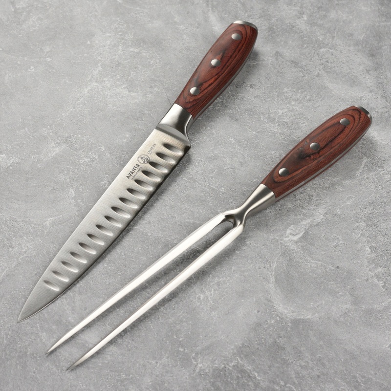 One-piece fully forged, full tang German stainless steel bladesHandles are made of beautiful and durable pakkawood15 double bevel non-serrated fine edge blades; 56 Rockwell HardnessGerman high carbon stainless steel creates and holds a sharper edgeMade in