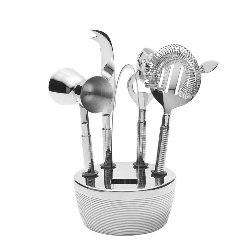 Make sure you always have all the cocktail mixing essentials on hand with this Mikasa Cheers 6-Piece Bar Tool Set with snack bowl. With fun lines throughout the tool handles and on the bowl, this set will be a welcomed and admired addition to your home bar. This set provides quick, easy access to neatly stored and displayed bar tools. The stylish stand can be removed from the bowl and features slots for all the tools, a strainer, a double jigger, a bottle opener, a bar knife, and ice tongs. The bowl can be used for your favorite nuts, pretzels or candies. It’s everything you need to stir up delicious drinks to get the party started! Each piece in the set is beautifully crafted of stainless steel and all are dishwasher safe.
