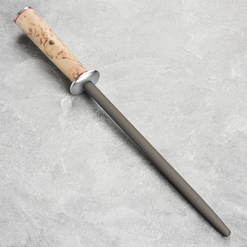 Tungsten is a metal that offers some of the highest tensile strengthTraditional Japanese D-shape handle, made of Karelian BirchwoodFeatures mosaic pin accent, complimented by a steel end cap with logoUse to maintain the knife blade between sharpeningsMade