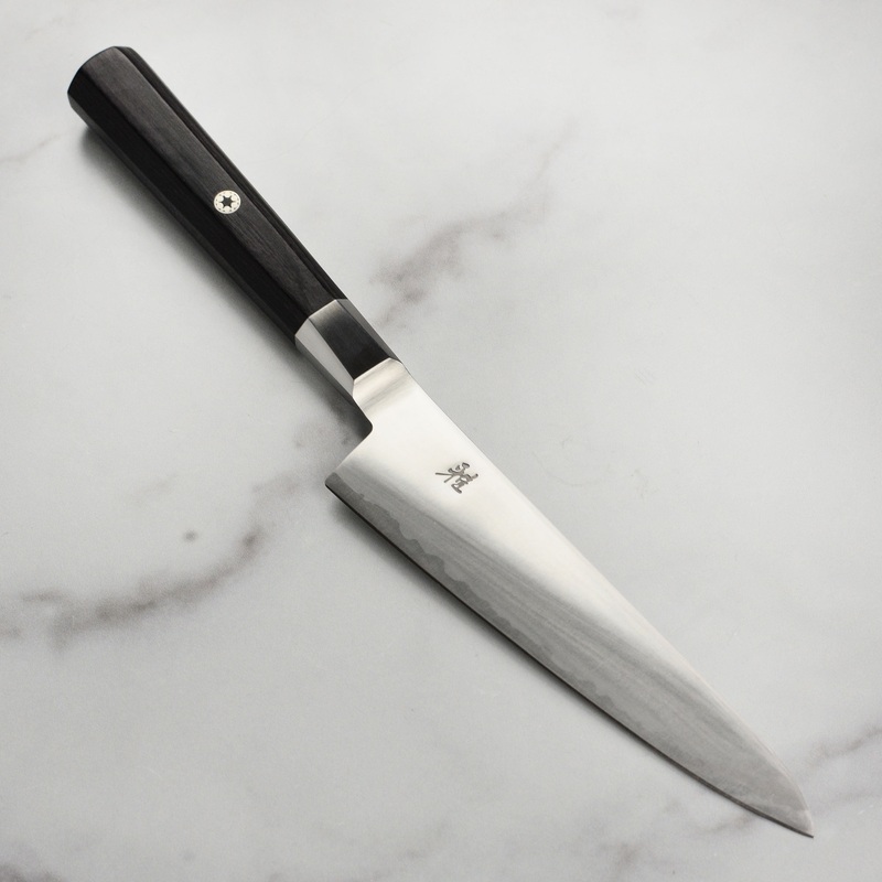 Constructed of revolutionary FC61 fine carbide stainless steel (4000FC) with 61 Rockwell hardness; hand-engraved Miyabi logo on bladeFull-tang ice-hardened Friodur2 blade with sandblasted Katana edge offers exceptional durability, cutting edge retentionHan