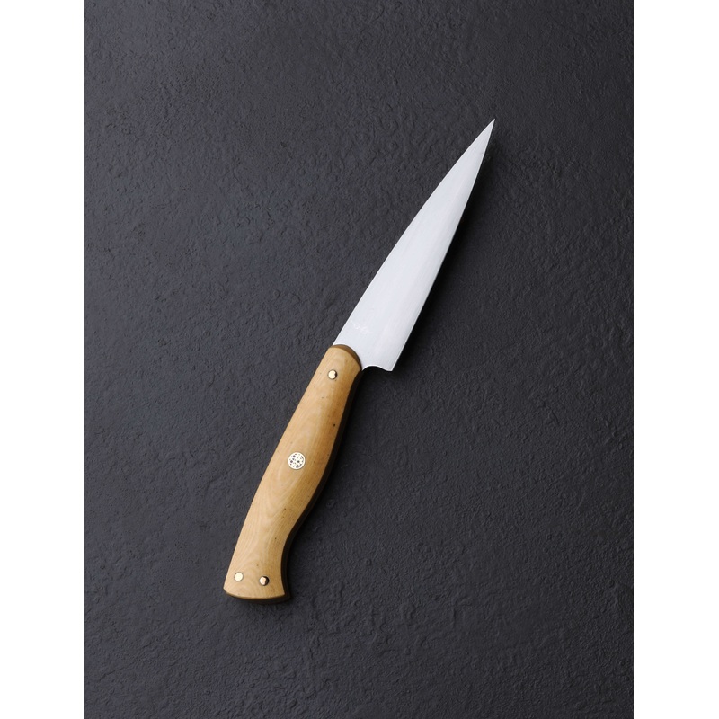 The moment has arrived: Don Carlos Andrade paring knives tend to be rare birds, and this one-of-a-kind build is the first of the 2024 holiday season to grace our collection. Dressed in vintage ‘Oatmeal’ Westinghouse micarta, the sculpted Western style full-tang handle is as comfortable as it is handsome, secured by three hand-peened brass pins and a single, intricate, multi-color mosaic pin in the center. Although it may try to steal the show, the handle is but the conduit to the hard-working blade, shaped from RWL-34 high-performance stainless steel, a blade-specific material made in small batches by Damasteel in northern Sweden. Don gives his pronounced and impressive freehand convex bevels, tough and robust above a thin edge, a silky, hand-sanded satin finish contrasted by the polished and rounded blade spine and choil. The spine tapers steadily forward from 2.5mm out of the handle to an especially fine, needle-like tip designed to perform any number of delicate and detail-oriented cuts. Whether working on the cutting board, or to peel, carve, and perform other handheld work above the board, this outsanding chef’s companion will be there through thick and thin.