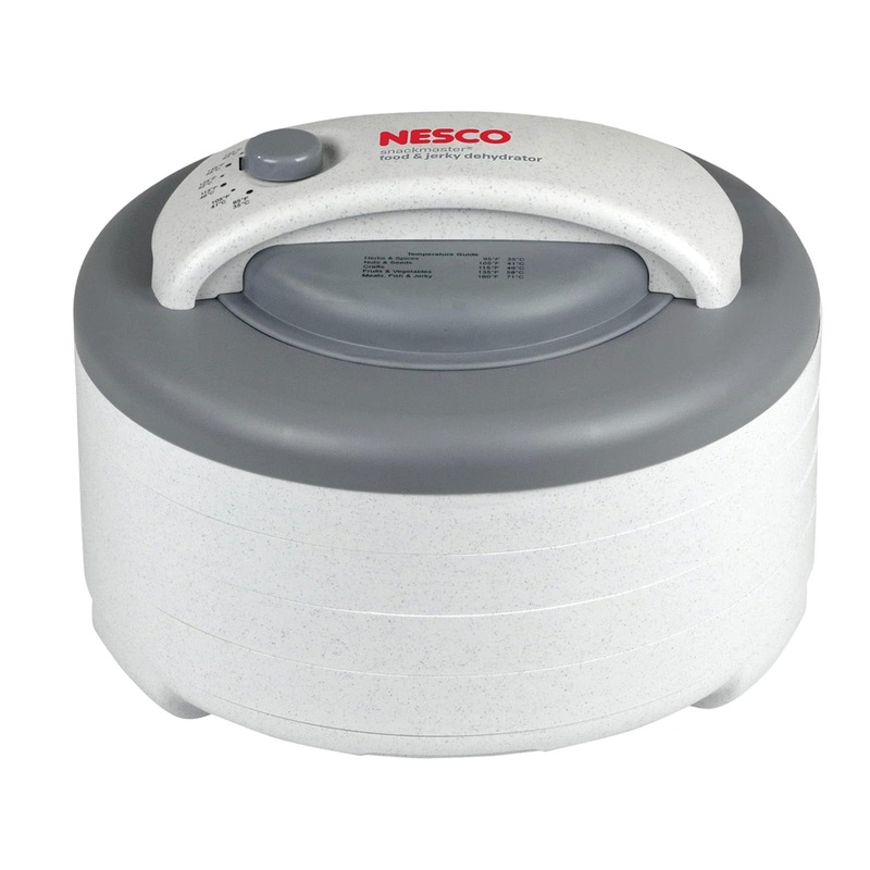 The NESCO FD-61 Snackmaster Encore Food Dehydrator's grey top and speckled design features 500 watts of drying power. This dehydrator generates maximum speed and quality for dehydrating fruits, vegetables, beef jerky, and venison jerky. Helps dry food in h