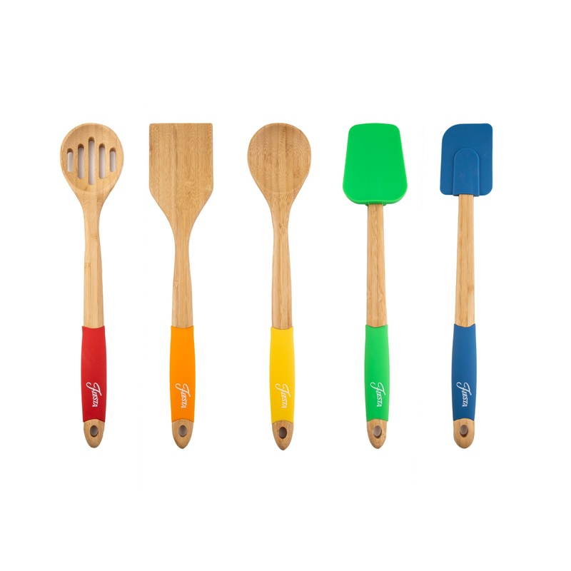Set includes one each bamboo turner, bamboo spoon, bamboo slotted spoon, silicone spatula and silicone turner.Durable Silicone is heat resistant up to 550F.MulticolorBamboo and SiliconeHand wash recommendedMade in China
