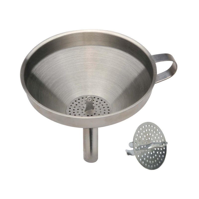 The Norpro 5.5-Inch Heavy Duty Stainless Steel Funnel is a versatile, durable tool perfect for cleanly transferring both liquids and solids. Made from high-quality stainless steel, it features a wide mouth for easy pouring and a detachable mesh strainer that catches seeds, pulp, or particles during transfer. This makes it ideal for canning, preserving, or even decanting oils and sauces. Its sturdy construction ensures stability and long-term use, while the wide rim and side handle provide excellent control. Whether youre filling jars with stock, soup, or jam, this funnel makes every job cleaner and easier.