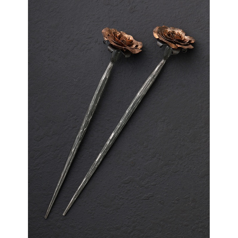 Named for the voluptuous, fragrant O’hara Rose, this extraordinary pair of chopsticks by artist Charlie Ellis is as much a pleasure to dine with as to be behold. Shaped by hand for balance and beauty in the Blue Ridge Mountains of North Carolina, Charlie’s former home and workshop, he forges stainless steel stems and tops each with strikingly detailed petals of bronze with steel leaves beneath. Designed to marry tactile comfort and dining bliss with the natural elegance of the flower’s form, Charlie’s thoughtful details provide a culinary experience like no other. A one-of-a-kind heirloom offering to inspire and delight.