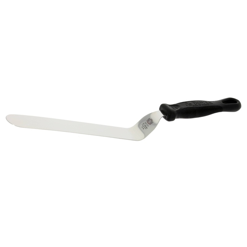De Buyer's 15" Offset Spatula is great for icing large cakes.Robust Stainless Steel.Ergonomic handle design.Anti-slip carbon fiber handle.Made in France.