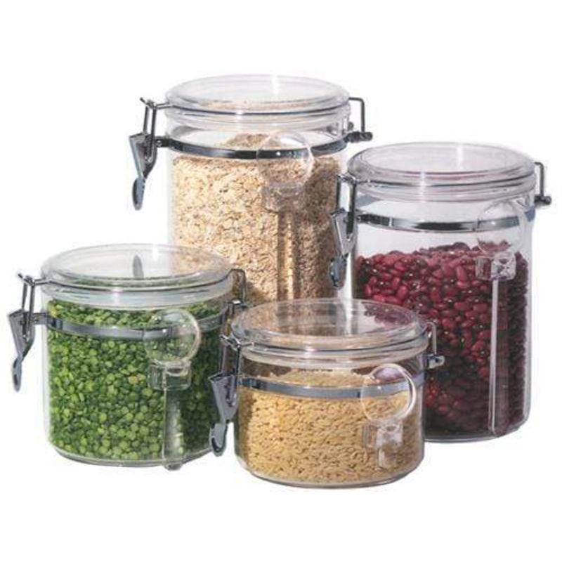 This acrylic canister set will coordinate with any kitchen scheme. It allows you to easily spot your baking supplies, cereals, beans and much more. The chrome locking clamps have silicone gaskets to ensure an airtight seal. Includes 4 acrylic canisters: 28