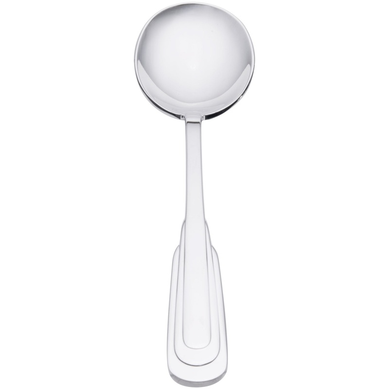 Set your table in style with this Oneida 2507SRBF Cityscape round bowl soup spoon. Featuring an intriguing, symmetrical design of tiers and curved lines, this flatware brings to mind images of metropolis skylines. Made out of 18/10 stainless steel for long