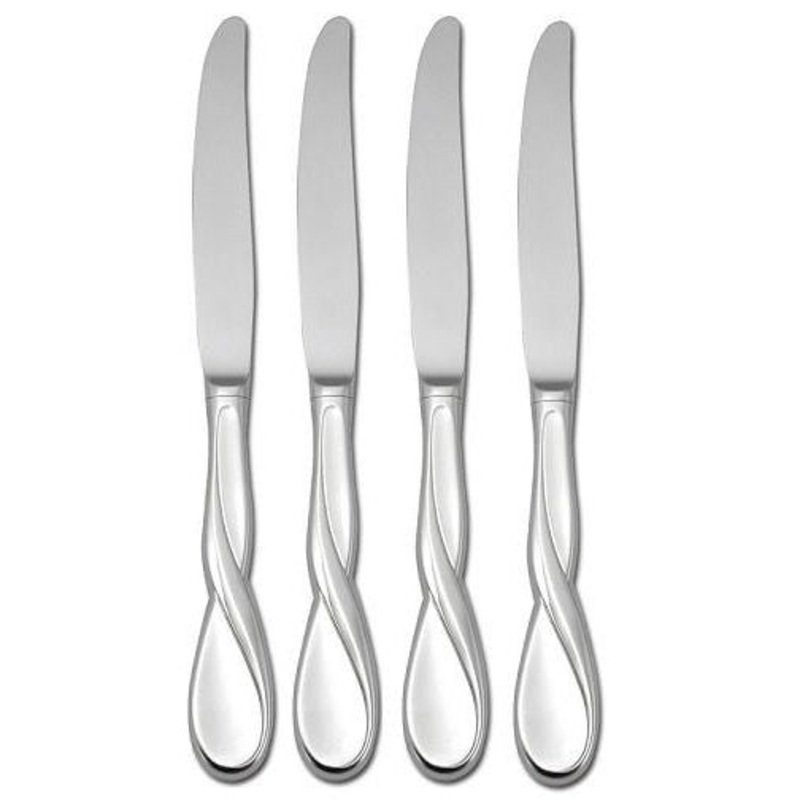 Aquarius Dinner Knives Set of 4 Fresh and Fluid. Reminiscent of the sea in its movement and aesthetic details, Aquarius has a brightly polished, sculpted figure. With trident-like salad fork tines and a free flowing, elevated twist that glides across the h