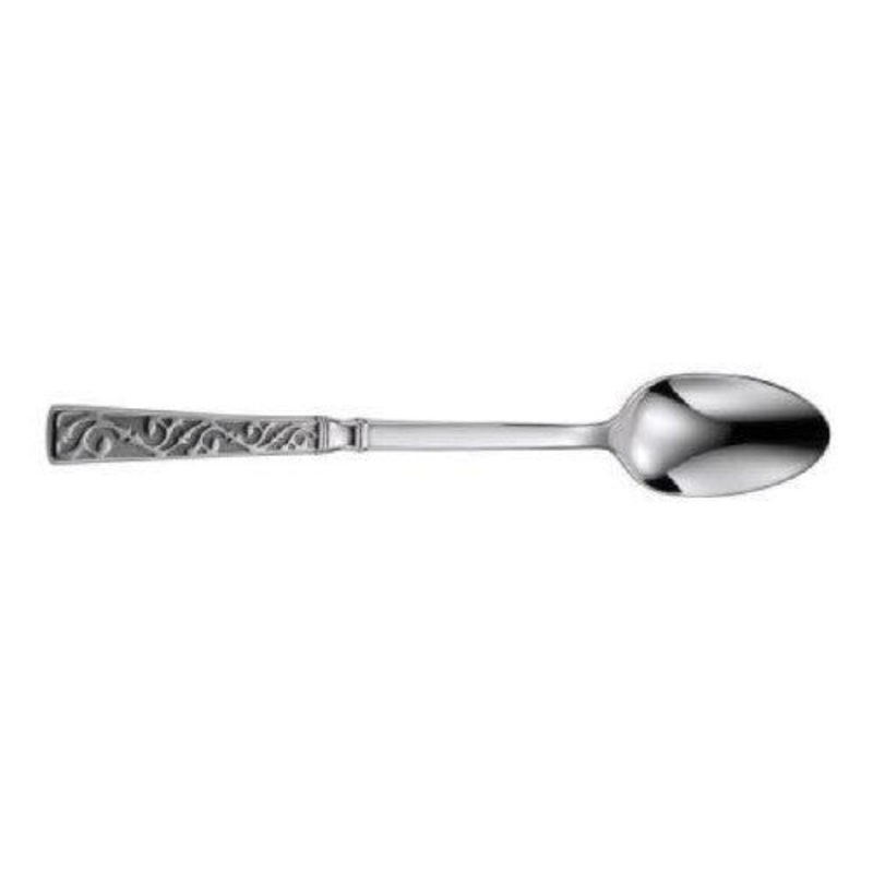 Castellina Iced Tea Spoon A Distinctive Design. Triple bands encase a gentle taper above an embossed leaf design that scrolls over the textured, square tip handle. Highly polished headpieces create an attractive contrast to the oxidized handle and add to t