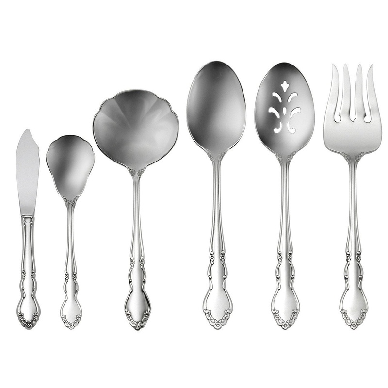 This serving set includes all the basic serving utensils for a well-rounded meal. These pieces will be able to serve the meat, side dishes such as potatoes or vegetable, sauces or soup, butter for bread and sugar for coffee and tea after the meal.