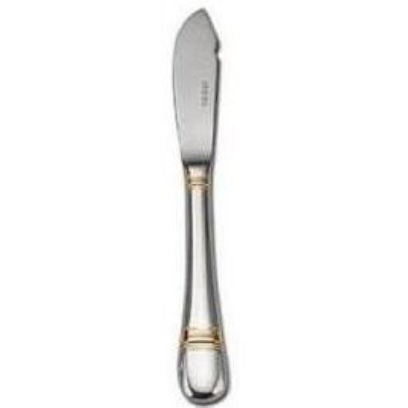 Golden Astragal Butter Knife Decorative bands extending around the handle are accented in 24K gold electroplate, a striking contrast with the 18/10 stainless mirror finish. A masterful accompaniment for fine dining. 18/10 Stainless Steel. 18% Chromium for