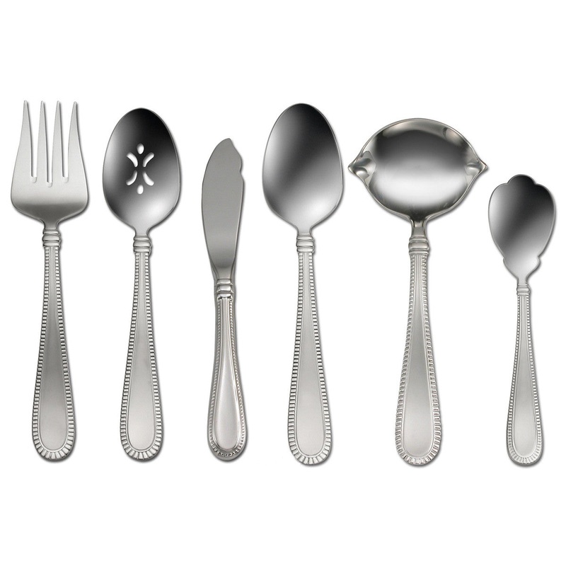 This serving set includes all the basic serving utensils for a well-rounded meal. These pieces will be able to serve the meat, side dishes such as potatoes or vegetable, sauces or soup, butter for bread and sugar for coffee and tea after the meal.