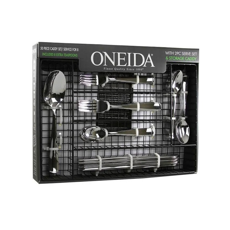 Set includes 8 salad forks,8 dinner forks,8 dinner knives,8 dinner spoons, 16 teaspoons, 1 serving spoon, 1 pierced serving spoon and 1 storage caddy.Contemporary design with clean lines exudes understated eleganceMirror Finish18/0 stainless steelDishwashe