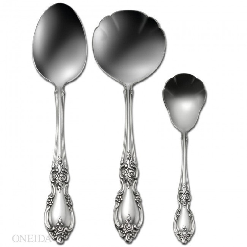 Oneida Louisiana patternCopious Class. Clusters of floral detailing grace Louisiana's tip end and scroll along the edge, meeting again to create a small, clear pool of highly polished reflection. Finely sculptured lines glide up the handle edge, ending in