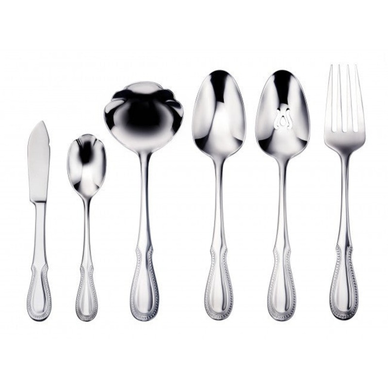 This serving set includes all the basic serving utensils for a well-rounded meal. These pieces will be able to serve the meat, side dishes such as potatoes or vegetable, sauces or soup, butter for bread and sugar for coffee and tea after the meal.