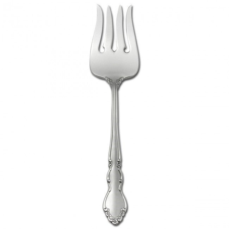 Satin Dover Serving ForkNatural Elegance. Tendrils of blossoms and leaves scroll up the sculpted handle's edge, leaving the satin finish of the handle center shining and unadorned. The decorative edging concludes delicately at the narrow point, opening up