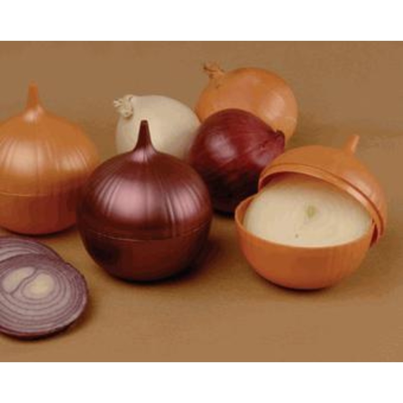 Contain onion odors while keeping cut onions fresh and moist. Made to look just like an onion, this will never be lost and forgotten in the fridge. Made of plastic, the 2 sides attach by twist lock. Airtight and dishwasher safe.Gourmac # 39-59