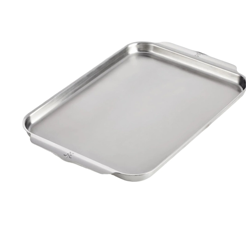 Warp-resistant cladroasting sheet pan features wide curved handles, providing an easily accessible, firm hold when removing from the oven, even when wearing oven mitts. Brushed stainless steel interiors and polished exteriors givethis pan a lasting aesthetic that keeps it looking newer and longer. This gourmetsheet pan is broiler safe and oven safe to 600F to accommodate a wide range of recipes.