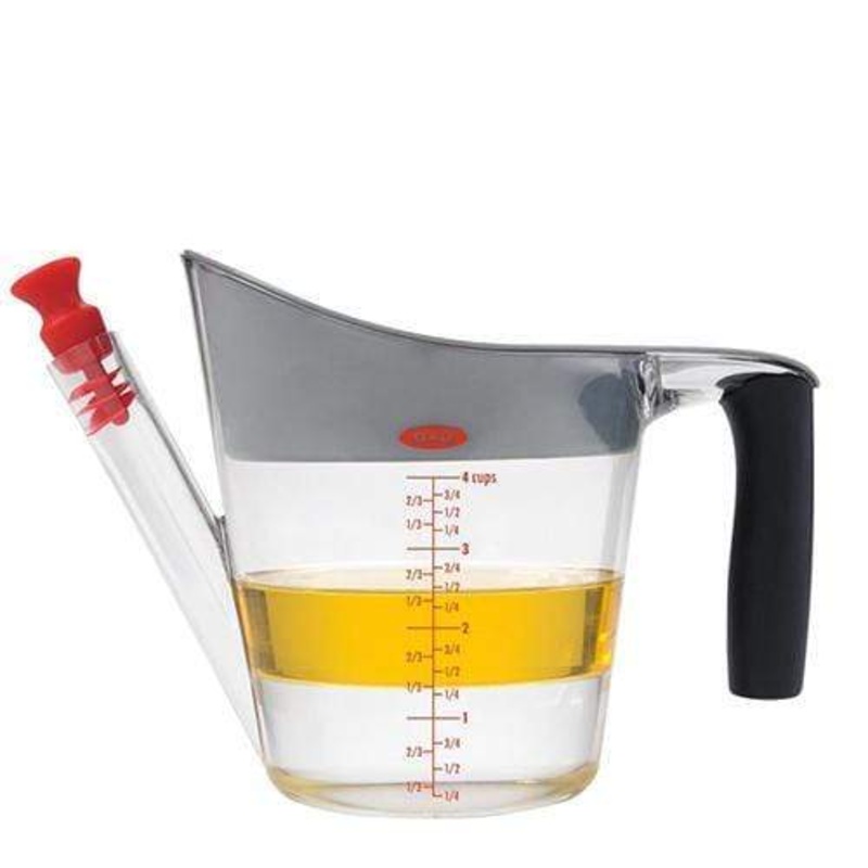 Cut the fat with the OXO Good Grips Fat Separator with its own strainer and stopper. Pour your gravy into the Separator and watch the fat rise to the top while lean gravy settles to the bottom. The heat-resistant strainer catches unwanted bits, and the sto