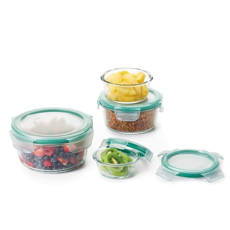 Lock in the fresh flavors of leftovers and preserve fruits and vegetables for savory meals with the 8-Piece Glass Round Food Storage Set by OXO Good Grips. Lids have locking tabs and a silicone gasket to form a leak-proof seal.Store leftovers or lunch with