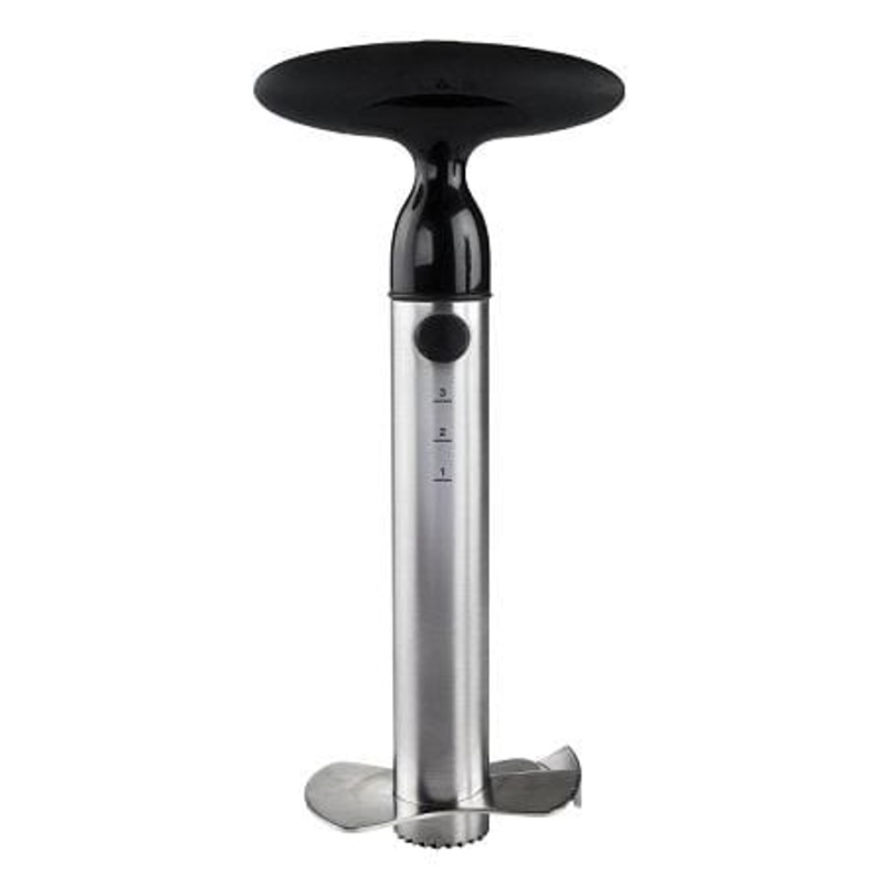 The OXO Good Grips stainless steel pineapple slicer, cores and slices a whole pineapple quickly and easily. Simply slice off the top of a fresh pineapple and twist the slicer onto the exposed fruit to create perfect pineapple rings. The ratcheting handle makes it easy to core pineapples quickly without having to constantly readjust your grip. Unique measurement markings on the slicer determine your pineapples height before slicing so you know when it is about to reach the bottom of the fruit. This feature ensures an intact pineapple shell to fill with fruit salad or a festive cocktail if desired. The turning knob features a soft, comfortable, non-slip grip and separates from the shaft for easy cleaning. The sharp, medium-sized, stainless steel blade was designed to accommodate most pineapple sizes and its compact shape makes it easy to store when not in use.