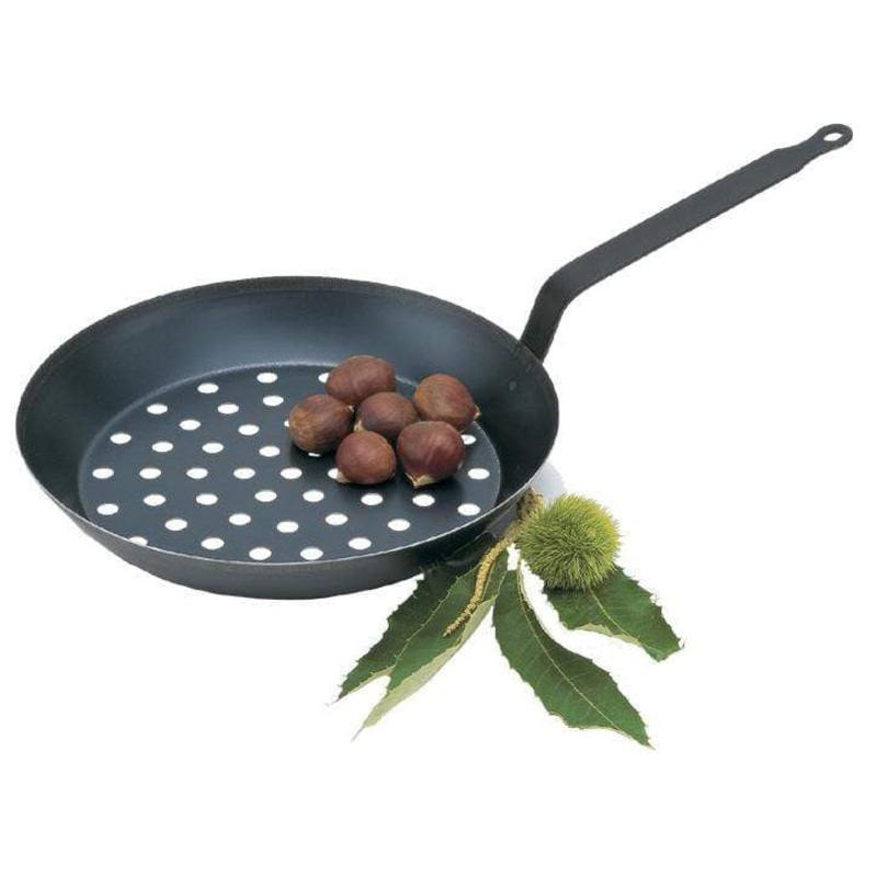This pan's broad, shallow surface allows for easy chestnut roasting.It has large perforations which allow for significant flame contact, enhancing the roasted, smoky flavor.It is made of blue steel with a long iron handle, perfect for roasting chestnuts.Di