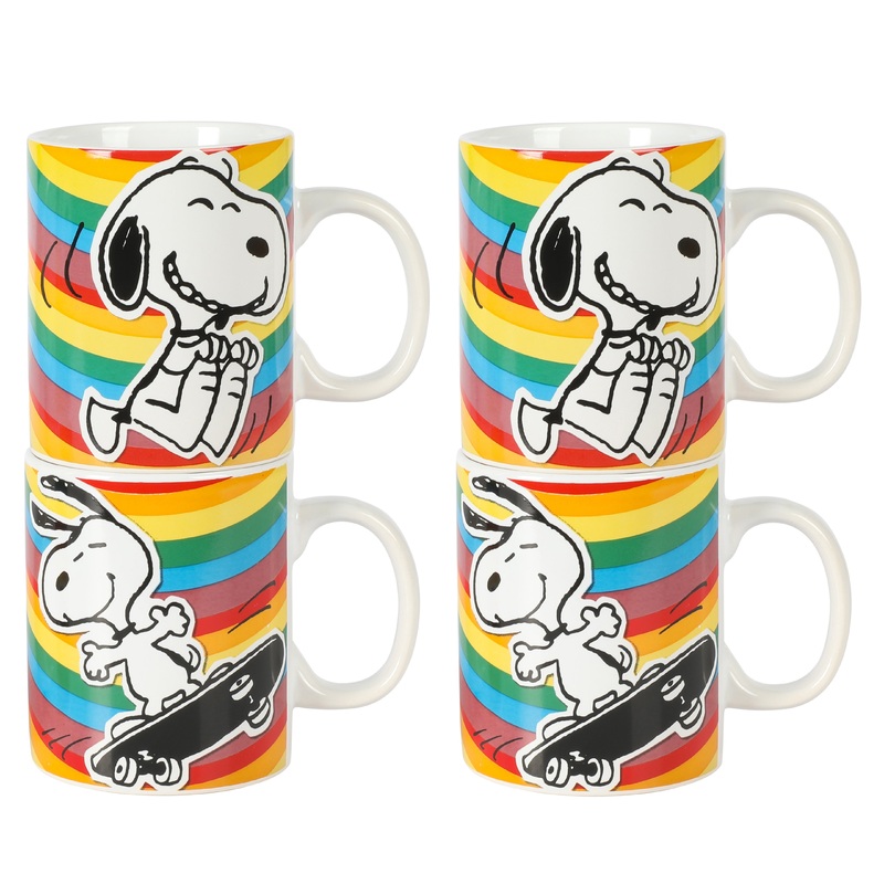 Celebrate every day with the Peanuts gang and their 70th Anniversary Stoneware 4-piece Mug Set. On October 2nd, 1950, Charlie Brown first appeared on the comics pages of seven American newspapers. Nearly seven decades later, Peanuts has left an indelible mark on global pop culture. This set offers four rainbow Snoopy mugs, made from durable stoneware, to serve up hot or cold drinks all day. Give these mugs as a cool gift to family and friends or to someone who is a big fan of the Peanuts gang. Dishwasher and microwave safe.