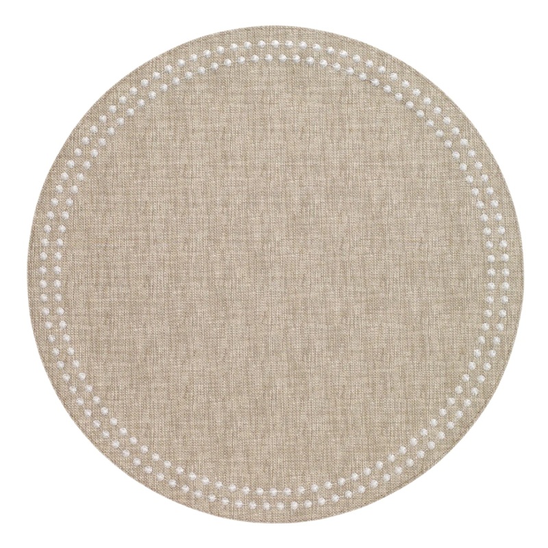 Round mats with pearl-like embroidered dots around the edge. Available in multiplecolors. Many colors have matching napkins, please see Pearls Napkins page under our Table Linens section.Set of 4Size: 15"x15" diameterMaterial: 100% Phthalate-free VinylCare