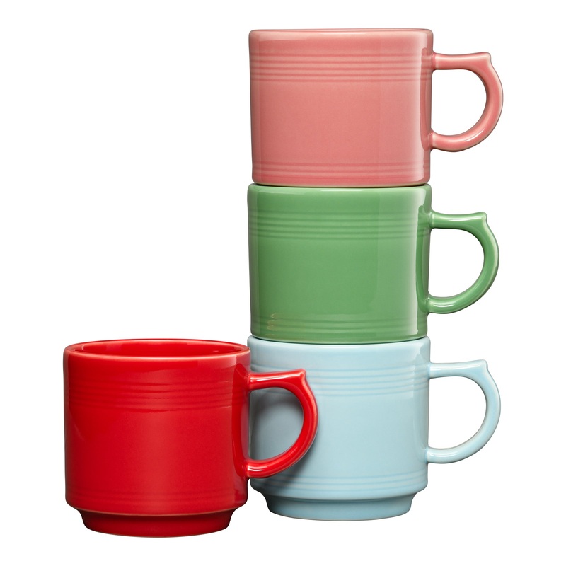 Set of 4Holds 16 ouncesHeight 3 7/8 inchesDiameter 3 7/8 inchesDishwasher, oven, and microwave safeFully vitrified lead-safe china with a color glazeMade in the USA.Mixed Peppermint Frost Colors include: Sky, Peony, Scarlet, Meadow