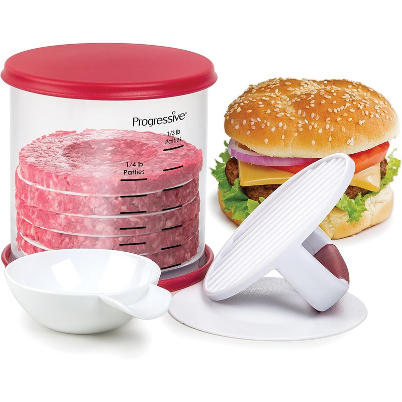 Press and store six 1/4 lb. Or 1/3 lb. hamburger patties. This Prepworks by progressive perfect burger press 11 piece set includes the main container, 2 storage lids, a meat scoop, press and 8 separating disks to keep the patties from sticking together. The meat scoop measures 1/4 lb. Patties. The separating disks are designed with ‘dimples’ to ensure patties maintain their shape while cooking. It is dishwasher safe.