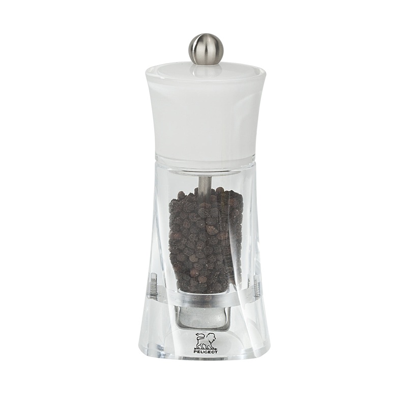 The transparency of an acrylic body and purity of a pearl white head for this Peugeot Molne collection pepper mill. A light and subtle combination that will bring a touch of elegance to your table. The Molne white pepper mill plays with transparency and mo