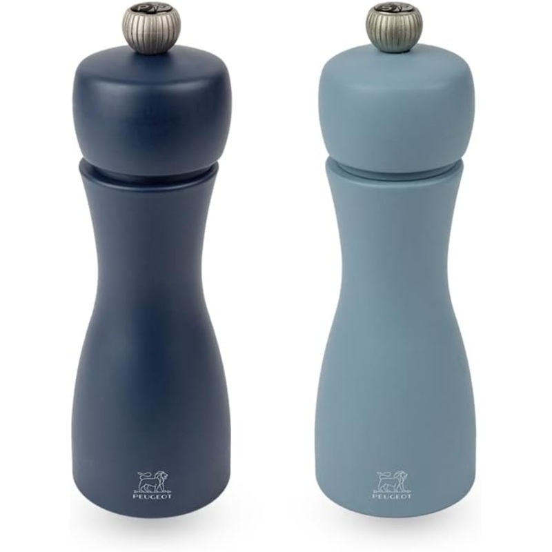 This Tahiti Air Set of Salt and Pepper Mills combine a classic hourglass figure with resplendent contemporary colours that will offer a cool, calming vibe to any table setting and look sensational in any kitchen. The midnight blue of the pepper mill perfectly complements the lighter azure blue of the salt mill and their contrasting shades ensure there is no confusion as to which is which. Each salt and pepper mill in the Tahiti collection is equipped with Peugeot’s lifetime-guaranteed steel mechanism. The exquisite “S” and “P” buttons that adorn the top of the salt and pepper mills conceal a smart feature for adjusting the grind setting. Made in France. Wood sourced from French PEFC-certified forests. Water-based paint. Five-year warranty for the salt and pepper mills. Pepper mill for grinding black, white, green, red and pink peppercorns (up to 15% in a blend) as well as coriander seeds. Salt mill for grinding dry rock salt with a crystal size of less than or equal to 4mm. Not suitable for use with wet, even dried sea salt. Grind adjustment button: the tighter it is screwed, the finer the grind and vice versa. Ready to use with peppercorns and salt crystals included. – 2/42967 – 14 – B60-2