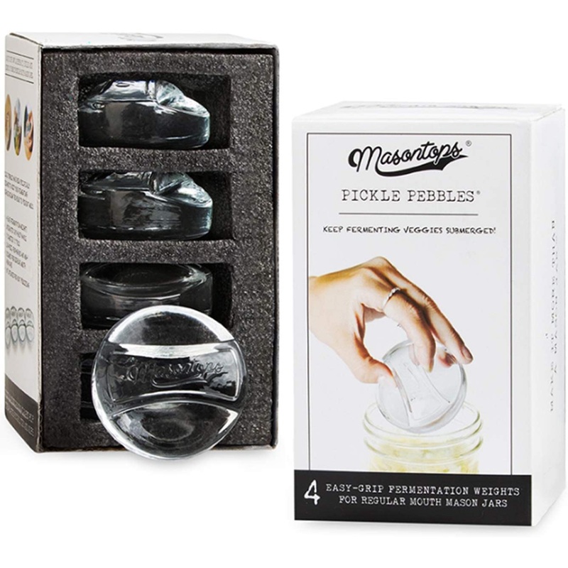 Our Pickle Pebbles come in both wide mouth and regular mouth types, and are perfectly-sized and weighted to ensure your veggies stay inside the brine and out of the air at the top of the jar, which can lead to spoilage and food safety issues. They’re non-porous and completely food safe, so they do not absorb or release contaminants. And they’re made of crystal clear soda lime glass like the jars themselves, giving you a transparent view of the fermentation process inside the jar.