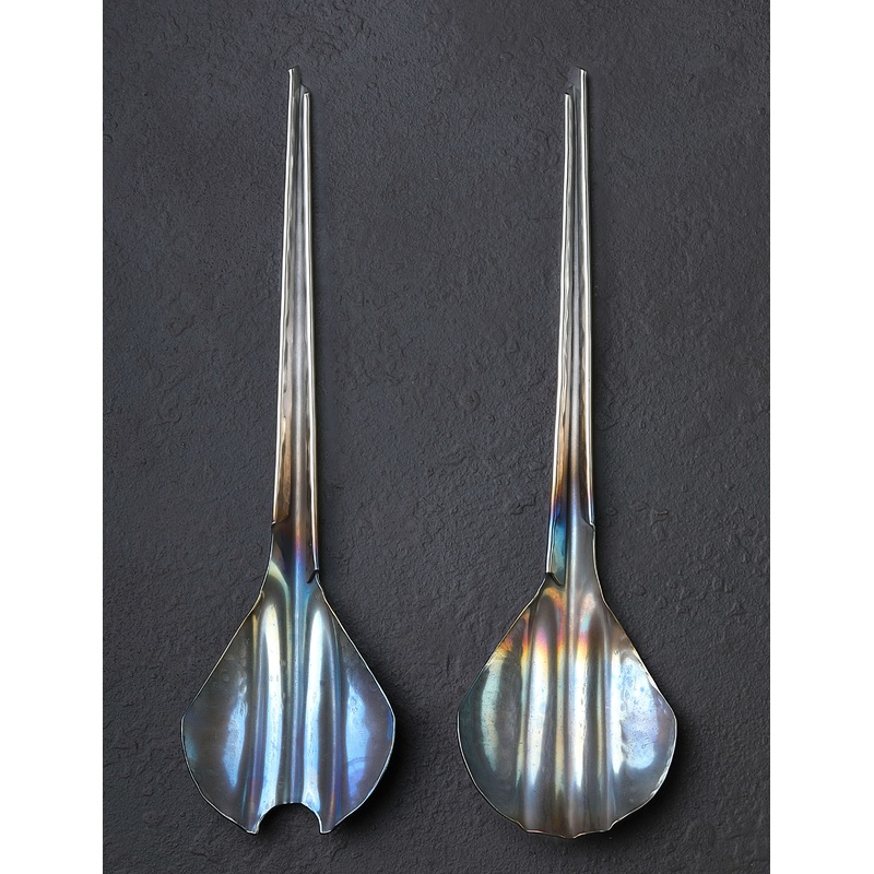 Each set of artist Stefanie Duecks Plica Salad Servers are fold formed and forged by hand at her studio in British Columbia. Beautifully unique in style and comfortably crafted for daily use in the dining room, form and function come together in a design t